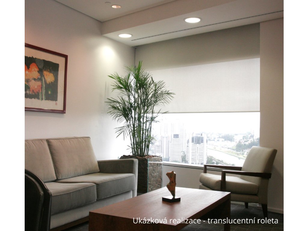 Elegantní motorizovaná translucentní látková roleta ve světle béžovém odstínu poskytuje jemné zastínění s pohledem ven a ideální rovnováhu mezi soukromím a otevřeností prostoru při příjemném rozptýleném osvětlení.